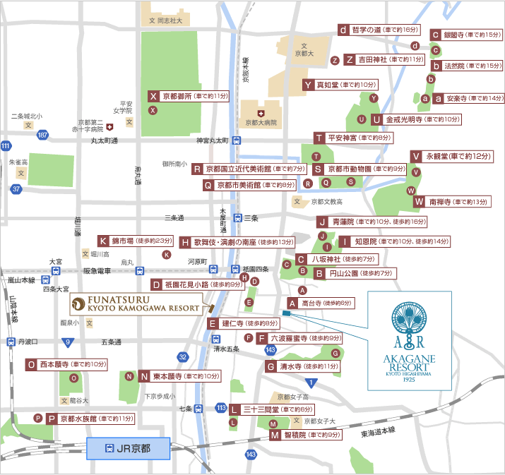 「河原町駅」よりAKAGANE RESORT KYOTO HIGASHIYAMA1925まで徒歩15分【車・タクシー】